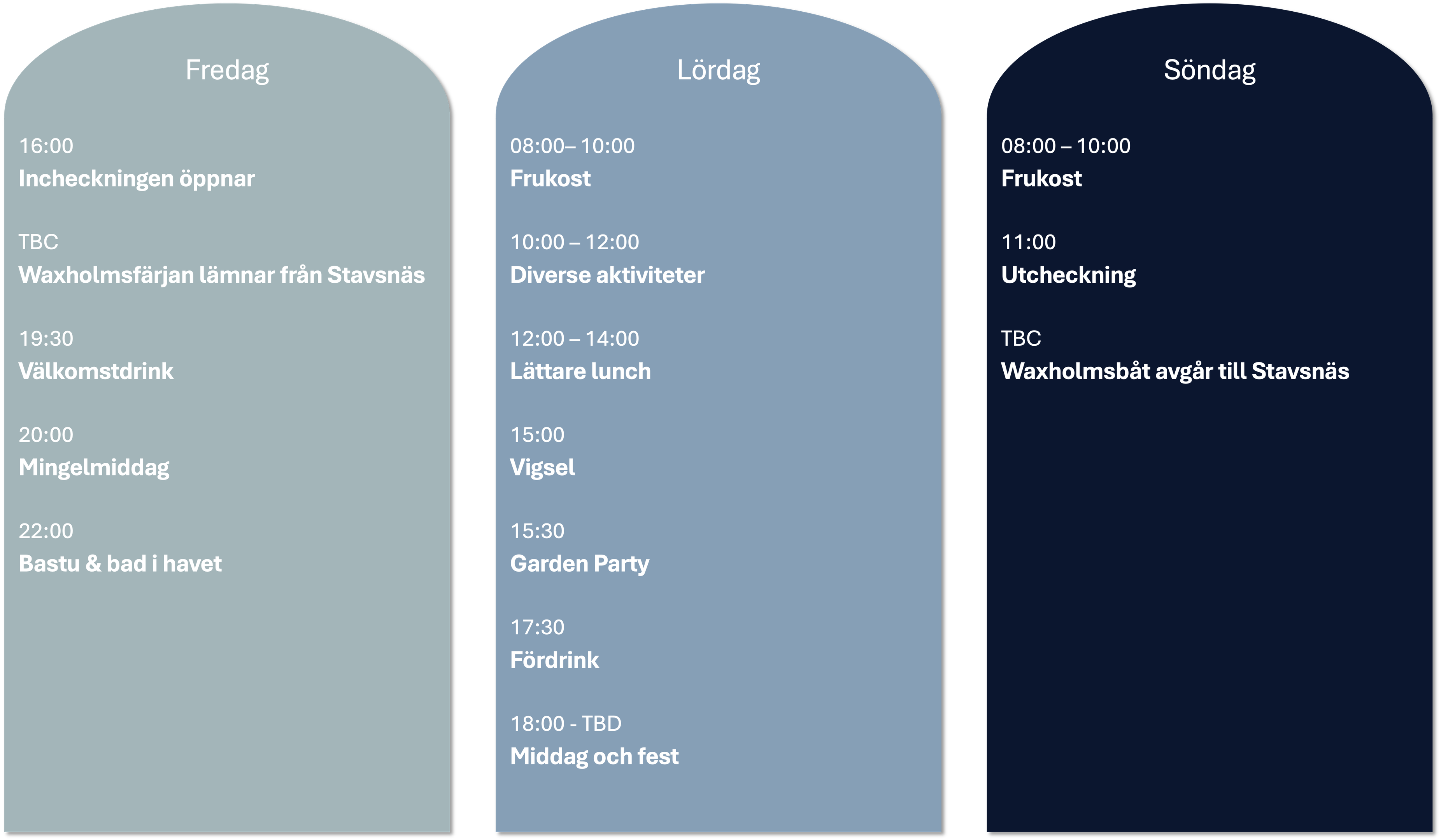 Värt att veta är att boendena är av varierande slag och utspridda runt ön. I vissa hus har man egna rum, i andra kommer man att dela. Extrasängar kommer även användas för att vi alla ska få plats. Vi kommer göra vårt bästa med att placera ut er så att ni får bo med andra som ni känner, men vi kommer också ta hänsyn till first come first serve vid RSVP.